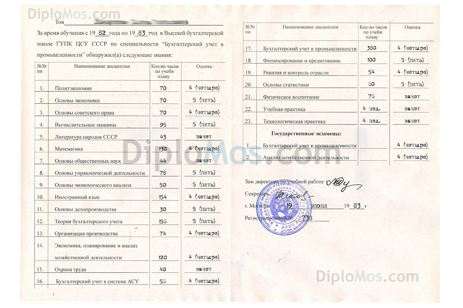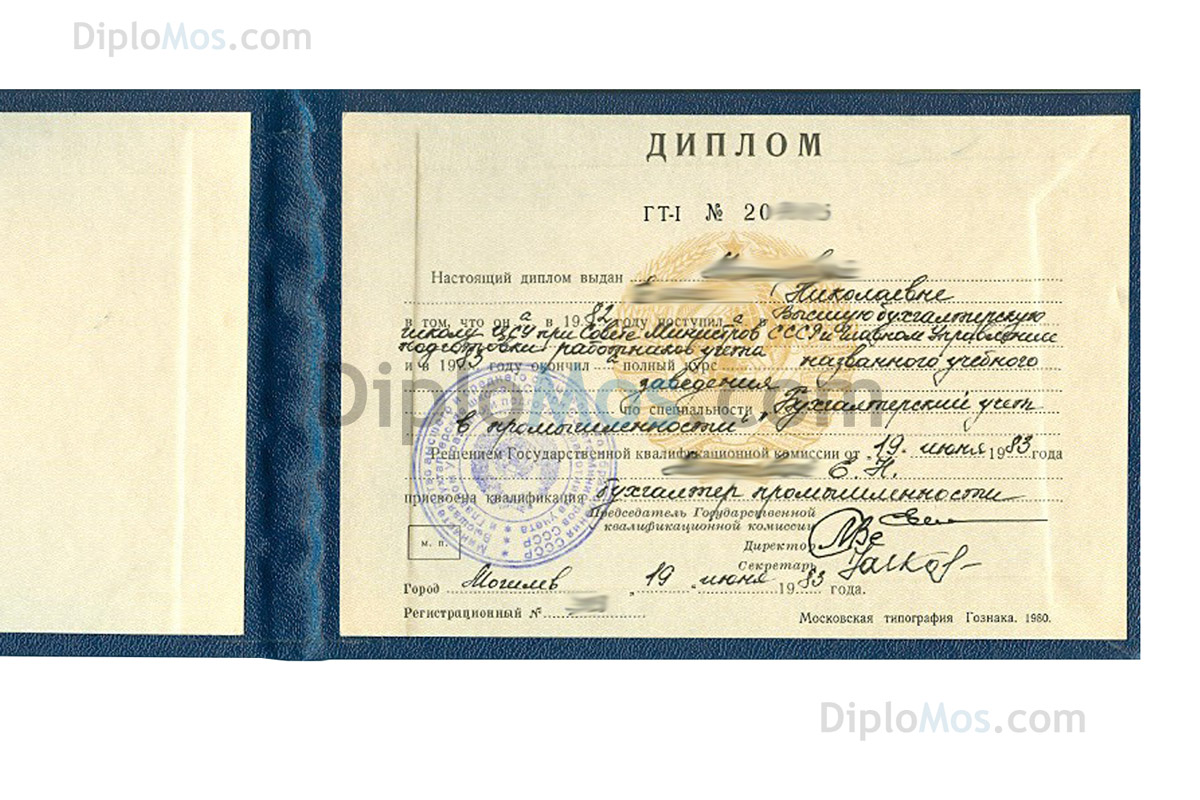 Настоящий диплом СССР об окончании техникума с символикой РСФСР, который выдавался в 1970-х, 1980-х, 1990-х годах до 1996 года включительно. Заполняется профессионалами как в ССУЗах по всем правилам того времени и в соответствии с Вашими пожеланиями. Заверяется гербовой советской «мокрой» печатью и подписями, максимально похожими на оригинальные.